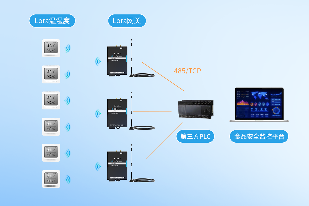 针对生鲜冷藏行业的痛点与需求,康耐德推出基于多 LoRa 网关和LoRa温湿度的生鲜冷藏温湿度监测一体化方案,通过 “LoRa 温湿度传感器 + 多 LoRa 网关 ”组合,实现对冷库进行全链路、高精度的温湿度数据采集与传输,配合PLC及食品安全监控平台,保障食品安全。