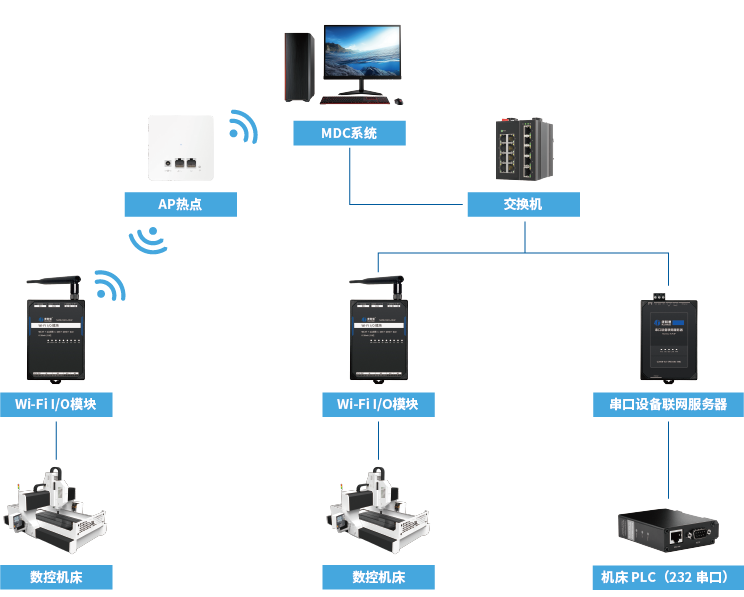 为满足MDC系统的数据采集与控制需求,康耐德为客户定制了 “串口服务器 + Wi-Fi I/O 模块” 组合方案,为客户构建起设备与 MDC 系统之间的稳定数据传输通道,形成一站式智造工厂数据采集与控制解决方案。