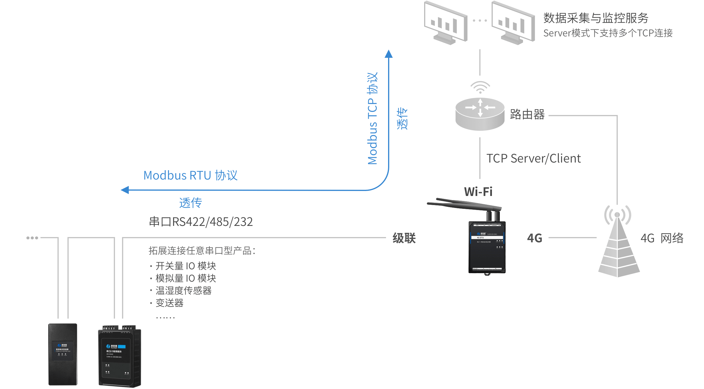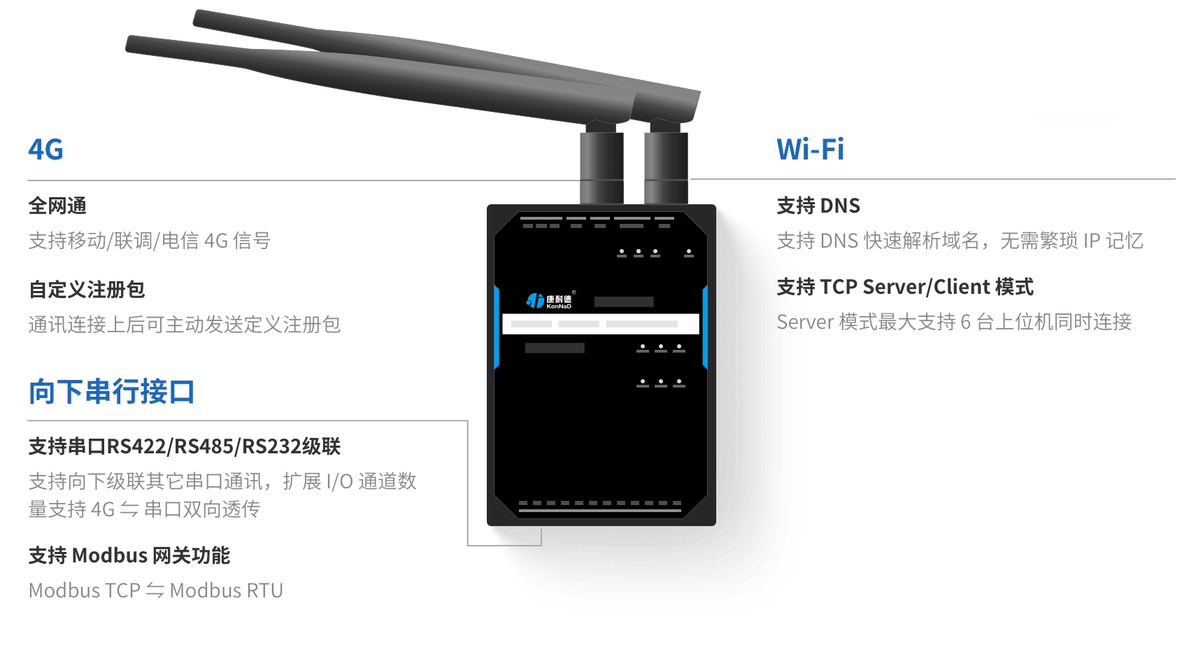 对上提供4G无线传输,实现RS232/485/422与4G/WiFi双向透明传输