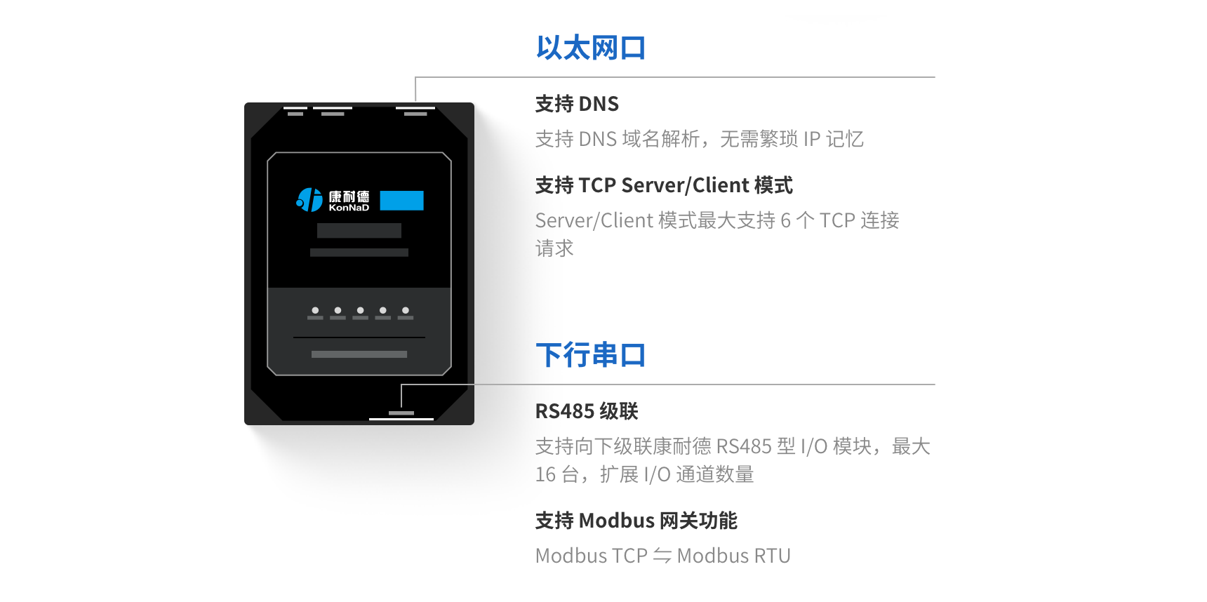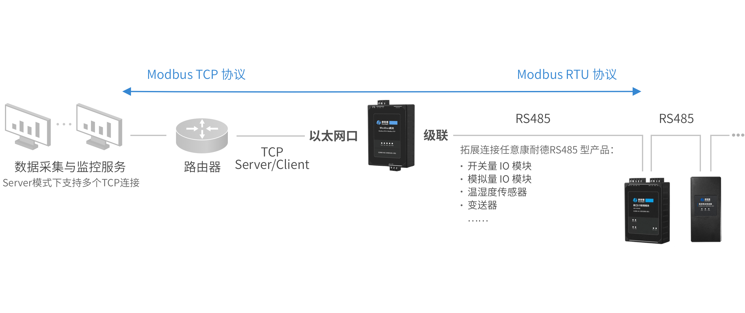 提供 Modbus TCP 与 Modbus RTU 协议转换,