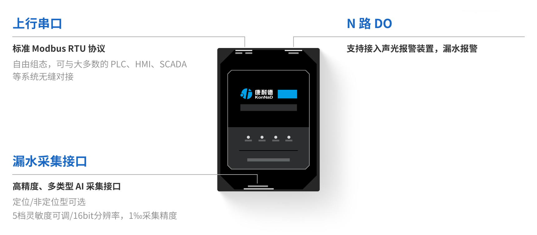 对上提供 1 路 RS485 通信接口,实现漏水情况、漏水位置等状态检测功能