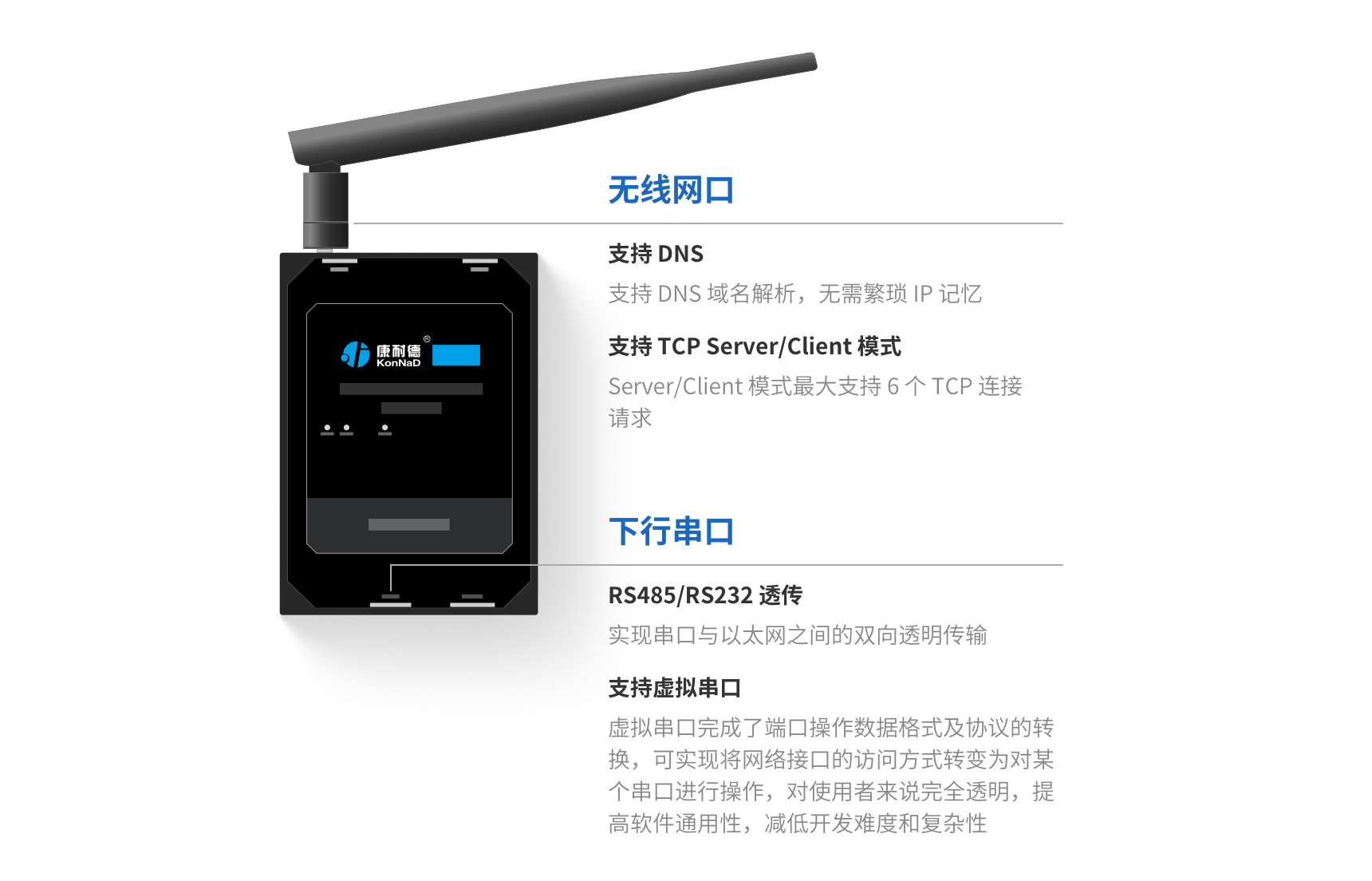 | 型号 | 无线参数 | 向下串行接口 | 波特率 | DNS | 最大连接数(TCP) | 外观 | ||